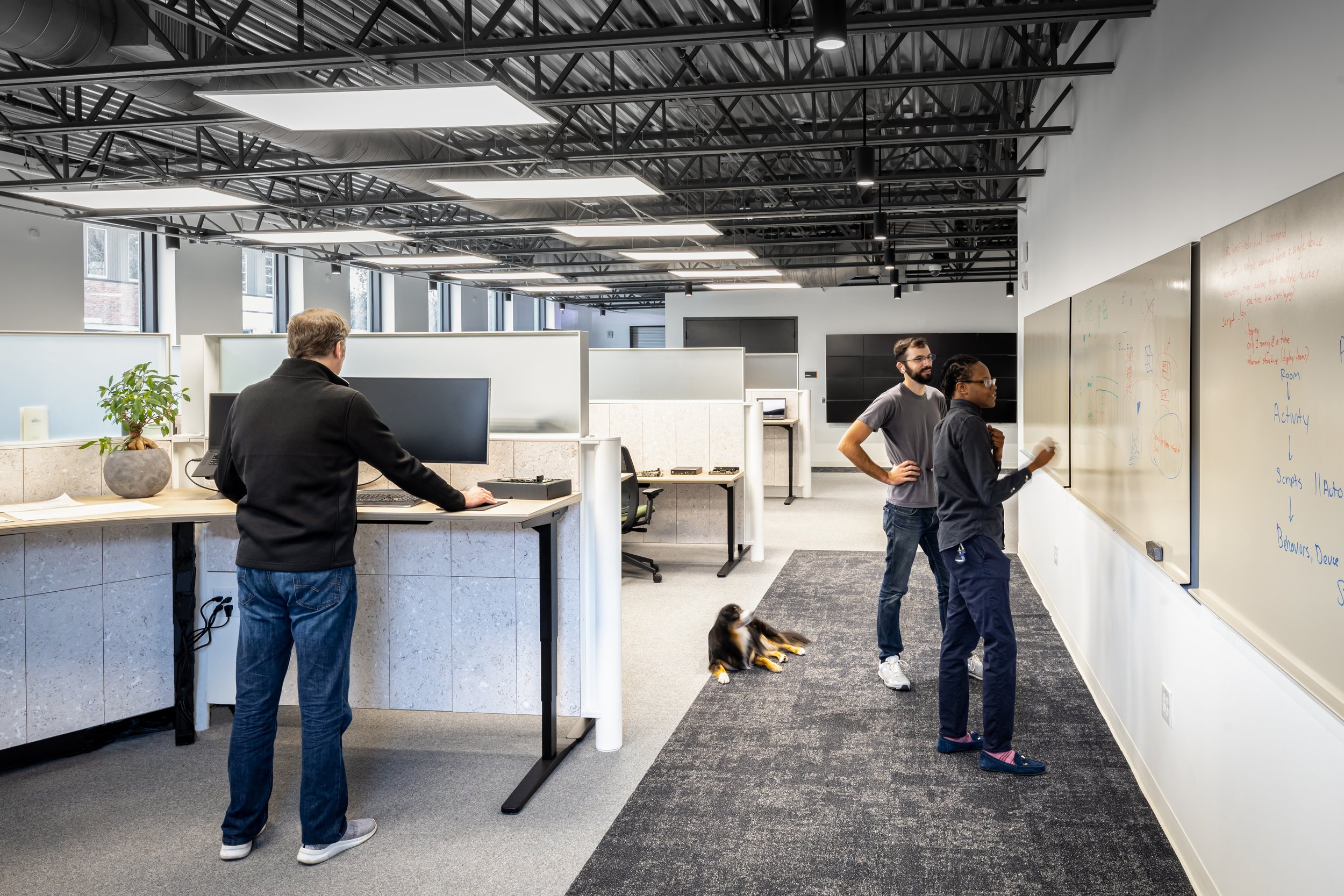 Research & Development takes place in a dedicated space with a high level of cognitive ergonomics. For example, custom workstations with adjustable-height wooden desks minimize clutter, diffuse daylight, absorb noise, and create a range of openness, privacy, and collaborative workspaces to suit the neurodiverse needs of individual team members [7, 8]. These features create an environment that is supportive of creativity [7], contributing to Haivision MCS’ ability to remain on the cutting-edge. Additionally, these features minimize the likelihood of human error, lost productivity, and inefficiencies [9].